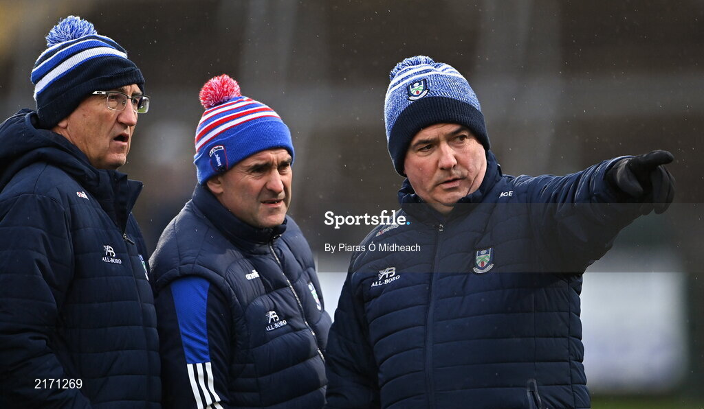 19 February 2022; Monaghan manager Séamus McEnaney, right, with members of his backroom team, from left, Donie Buckley, and Liam Sheedy before the Allianz Football League Division 1 match between Armagh and Monaghan at Athletic Grounds in Armagh. Photo by Piaras Ó Mídheach/Sportsfile