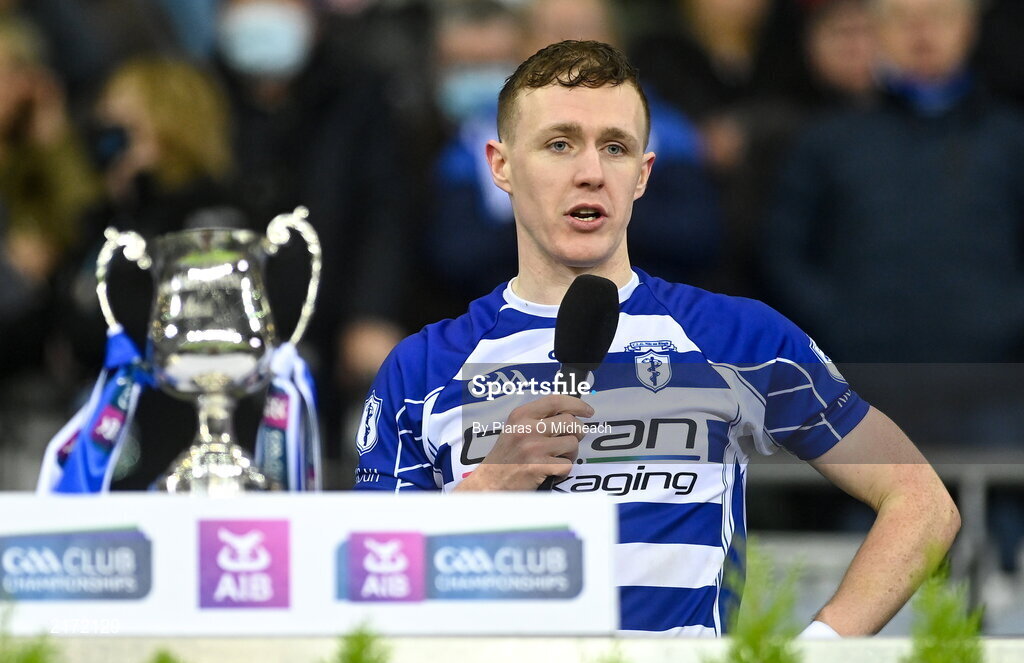 5 February 2022; Naas captain Brian Byrne makes his speech after his side's victory in the AIB GAA Hurling All-Ireland Intermediate Club Championship Final match between Kilmoyley, Kerry, and Naas, Kildare, at Croke Park in Dublin. Photo by Piaras Ó Mídheach/Sportsfile