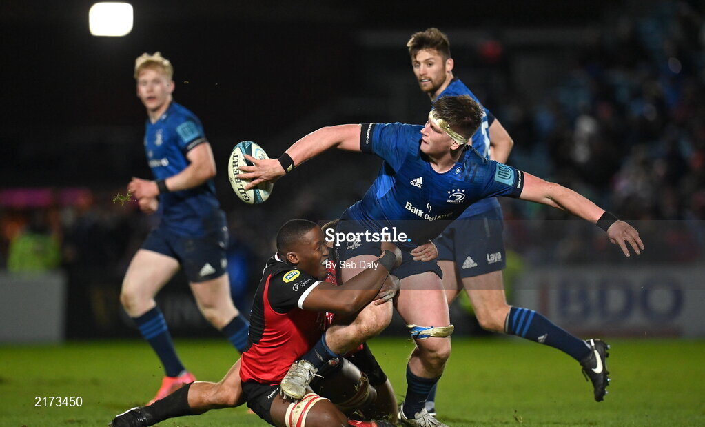 25 February 2022; Joe McCarthy of Leinster is tackled by Ruan Dreyer and Lunga Ncube of Emirates Lions during the United Rugby Championship match between Leinster and Emirates Lions at the RDS Arena in Dublin. Photo by Seb Daly/Sportsfile