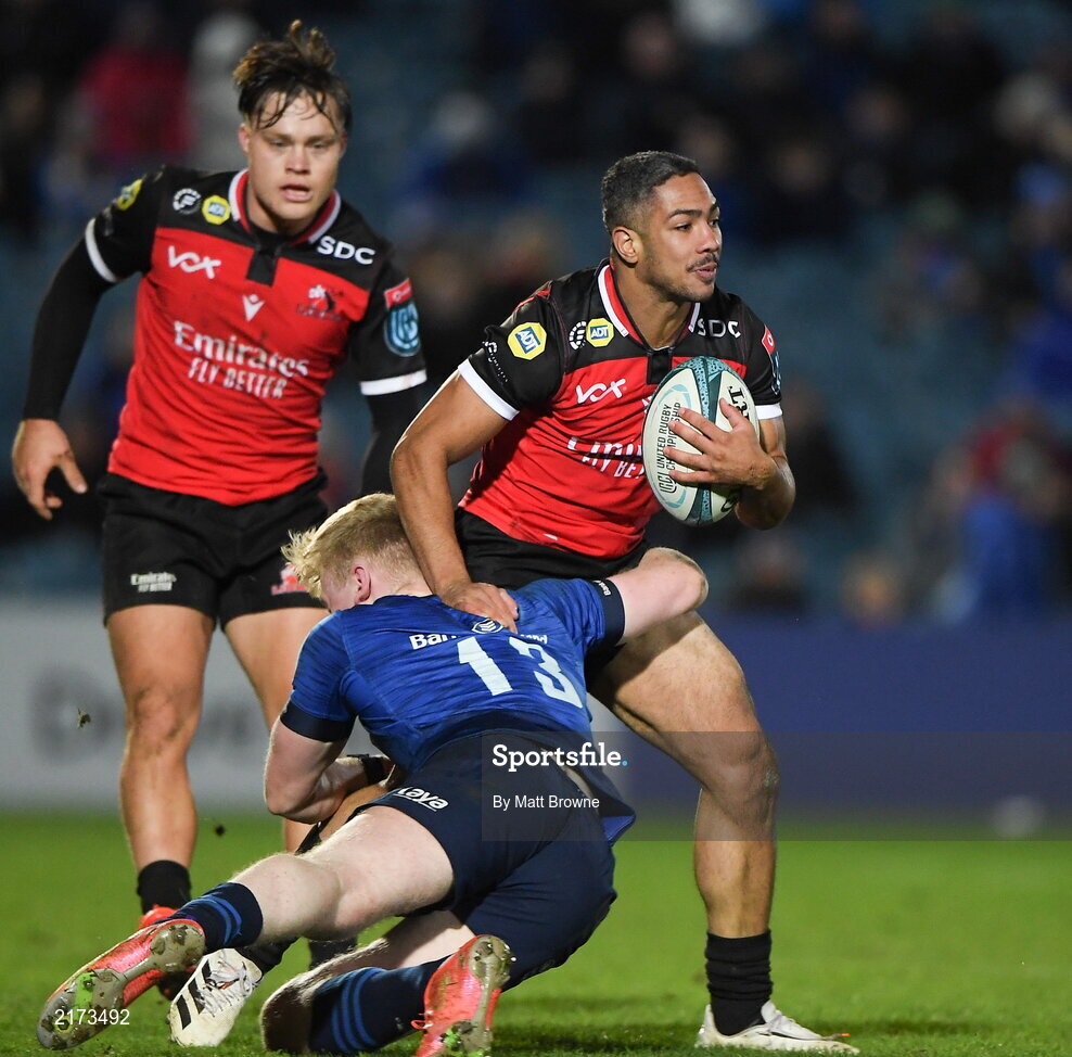 25 February 2022; Manuel Rass of Emirates Lions is tackled by Jamie Osborne of Leinster during the United Rugby Championship match between Leinster and Emirates Lions at RDS Arena in Dublin. Photo by Matt Browne/Sportsfile