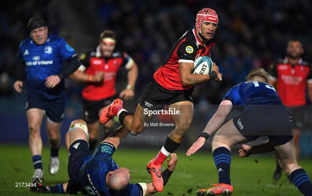 25 February 2022; Edwill van der Merwe of Emirates Lions is tackled by Rhys Ruddock and Jamie Osborne of Leinster during the United Rugby Championship match between Leinster and Emirates Lions at RDS Arena in Dublin. Photo by Matt Browne/Sportsfile