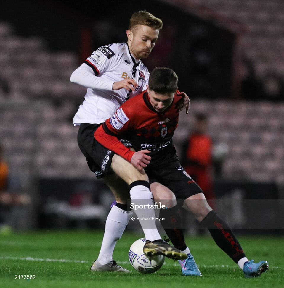 25 February 2022; Paul Doyle of Dundalk in action against Jamie Mullins of Bohemians during the SSE Airtricity League Premier Division match between Bohemians and Dundalk at Dalymount Park in Dublin. Photo by Michael P Ryan/Sportsfile