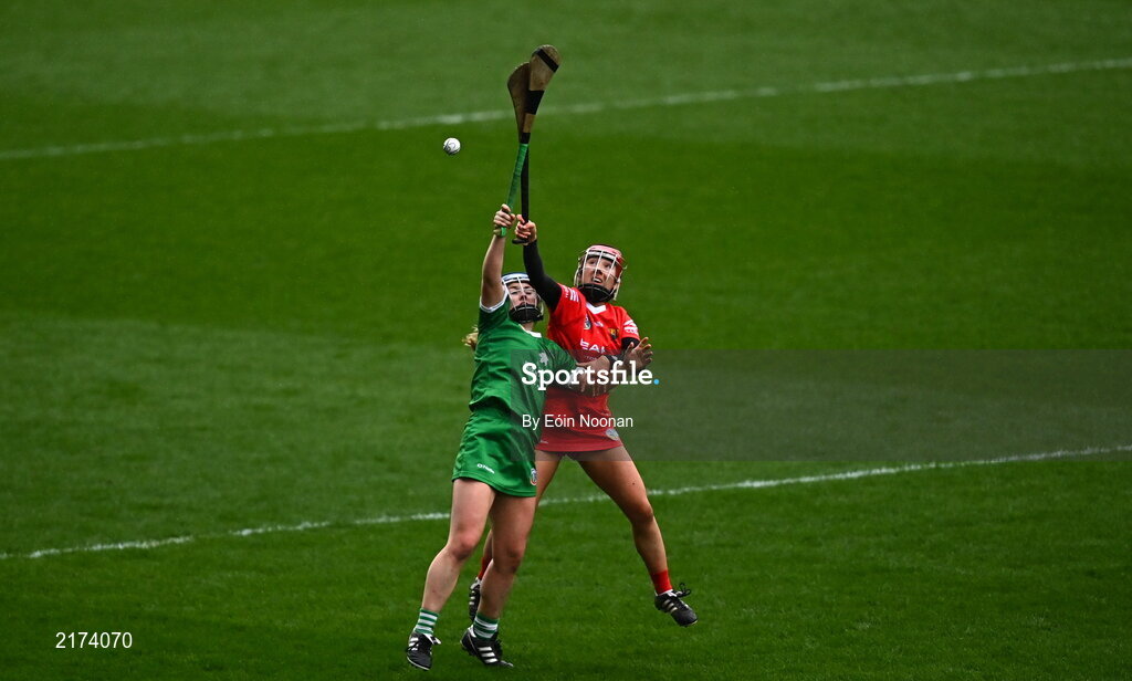 26 February 2022; Caoimhe Lyons of Limerick in action against Meabh Murphy of Cork during the Littlewoods Ireland Camogie League Division 1 Round 2 match between Cork and Limerick at Páirc Ui Chaoimh in Cork. Photo by Eóin Noonan/Sportsfile