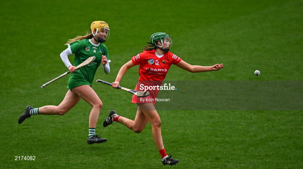 26 February 2022; Cliona Healy of Cork in action against Stephanie Woulfe of Limerick during the Littlewoods Ireland Camogie League Division 1 Round 2 match between Cork and Limerick at Páirc Ui Chaoimh in Cork. Photo by Eóin Noonan/Sportsfile