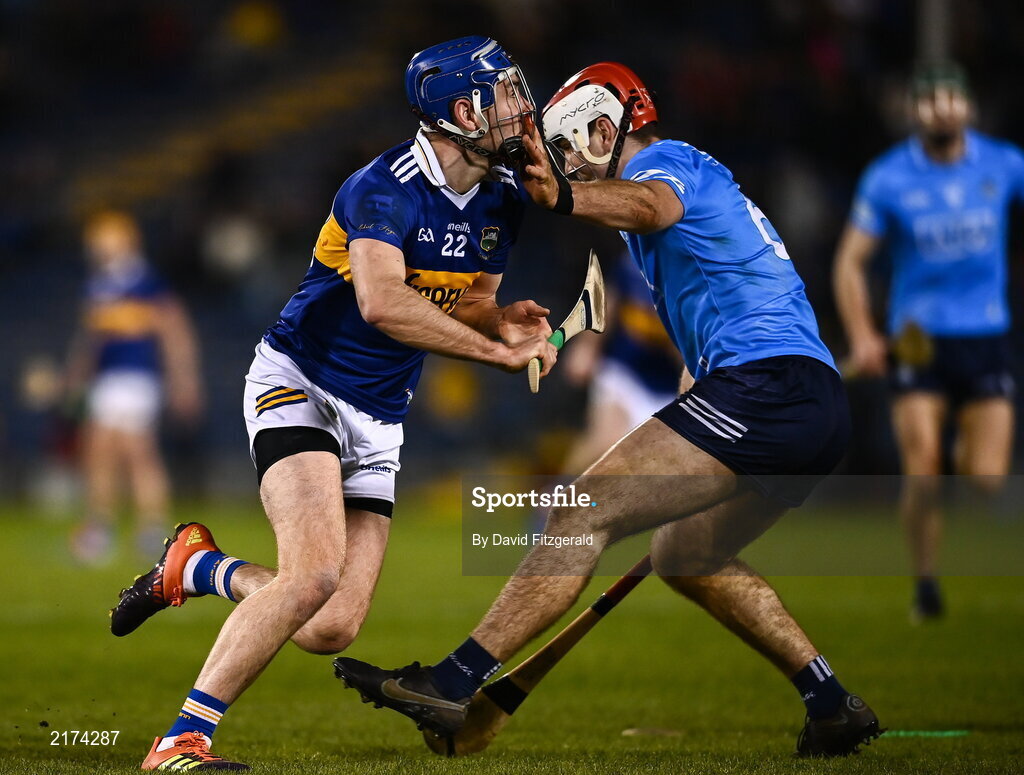 26 February 2022; John McGrath of Tipperary in action against Paddy Smyth of Dublin during the Allianz Hurling League Division 1 Group B match between Tipperary and Dublin at FBD Semple Stadium in Thurles, Tipperary. Photo by David Fitzgerald/Sportsfile