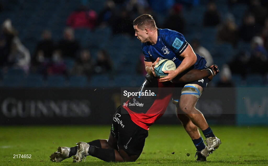 25 February 2022; Scott Penny of Leinster is tackled by Sti Sithole of Emirates Lions during the United Rugby Championship match between Leinster and Emirates Lions at the RDS Arena in Dublin. Photo by Seb Daly/Sportsfile