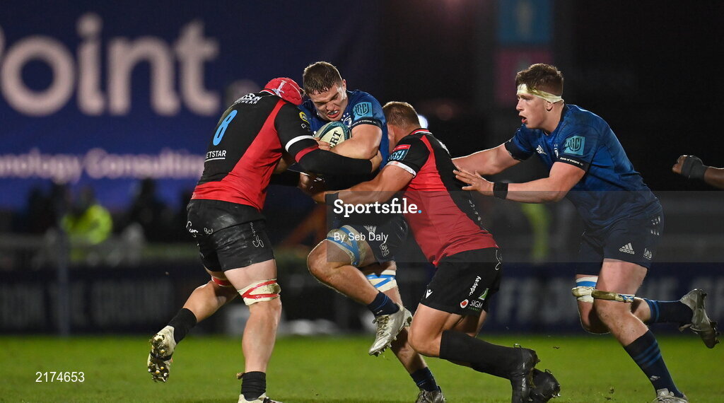 25 February 2022; Scott Penny of Leinster is tackled by Francke Horn, left, and PJ Botha of Emirates Lions during the United Rugby Championship match between Leinster and Emirates Lions at the RDS Arena in Dublin. Photo by Seb Daly/Sportsfile