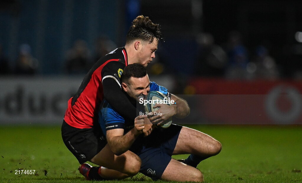 25 February 2022; Dave Kearney of Leinster is tackled by Quan Horn of Emirates Lions during the United Rugby Championship match between Leinster and Emirates Lions at the RDS Arena in Dublin. Photo by Seb Daly/Sportsfile