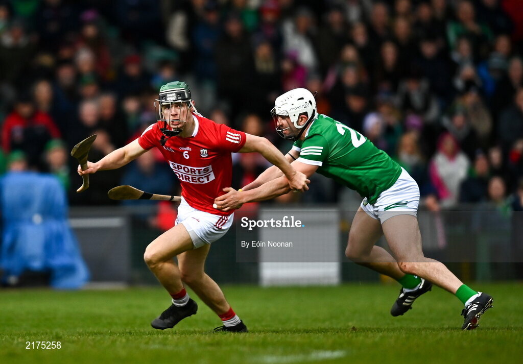 27 February 2022; Mark Coleman of Cork in action against Aaron Gillane of Limerick during the Allianz Hurling League Division 1 Group A match between Limerick and Cork at TUS Gaelic Grounds in Limerick. Photo by Eóin Noonan/Sportsfile