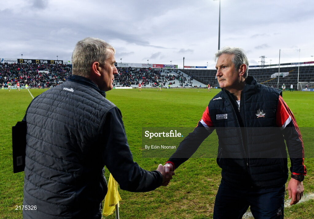 27 February 2022; Cork manager Kieran Kingston shakes hands with Limerick manager John Kiely after the Allianz Hurling League Division 1 Group A match between Limerick and Cork at TUS Gaelic Grounds in Limerick. Photo by Eóin Noonan/Sportsfile