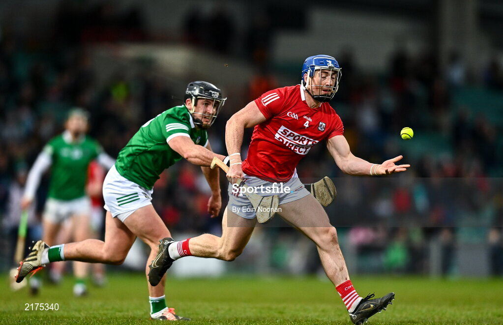 27 February 2022; Sean O’Donoghue of Cork of Cork in action against Darragh O'Donovan of Limerick during the Allianz Hurling League Division 1 Group A match between Limerick and Cork at TUS Gaelic Grounds in Limerick. Photo by Eóin Noonan/Sportsfile