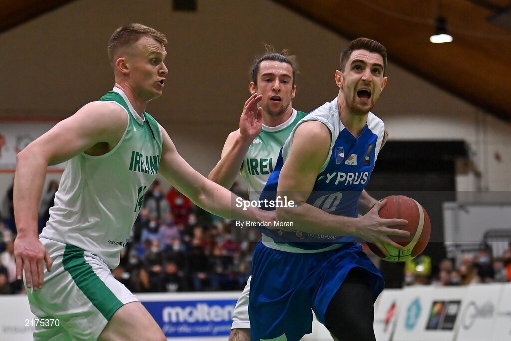 27 February 2022; Ioannis Giannaras of Cyprus in action against John Carroll and Lorcan Murphy of Ireland during the FIBA EuroBasket 2025 Pre-Qualifiers First Round Group A match between Ireland and Cyprus at the National Basketball Arena in Tallaght, Dublin. Photo by Brendan Moran/Sportsfile