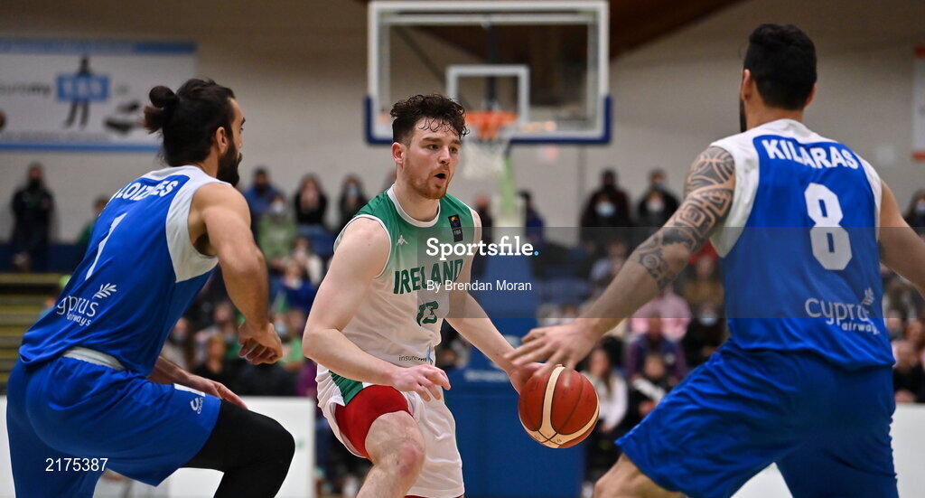 27 February 2022; Jordan Blount of Ireland in action against Christos Loizides and Gavriel Kilaras of Cyprus during the FIBA EuroBasket 2025 Pre-Qualifiers First Round Group A match between Ireland and Cyprus at the National Basketball Arena in Tallaght, Dublin. Photo by Brendan Moran/Sportsfile
