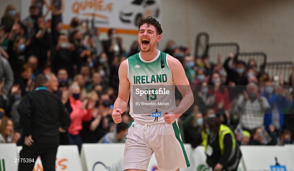 27 February 2022; Jordan Blount of Ireland celebrates victory in the FIBA EuroBasket 2025 Pre-Qualifiers First Round Group A match between Ireland and Cyprus at the National Basketball Arena in Tallaght, Dublin. Photo by Brendan Moran/Sportsfile