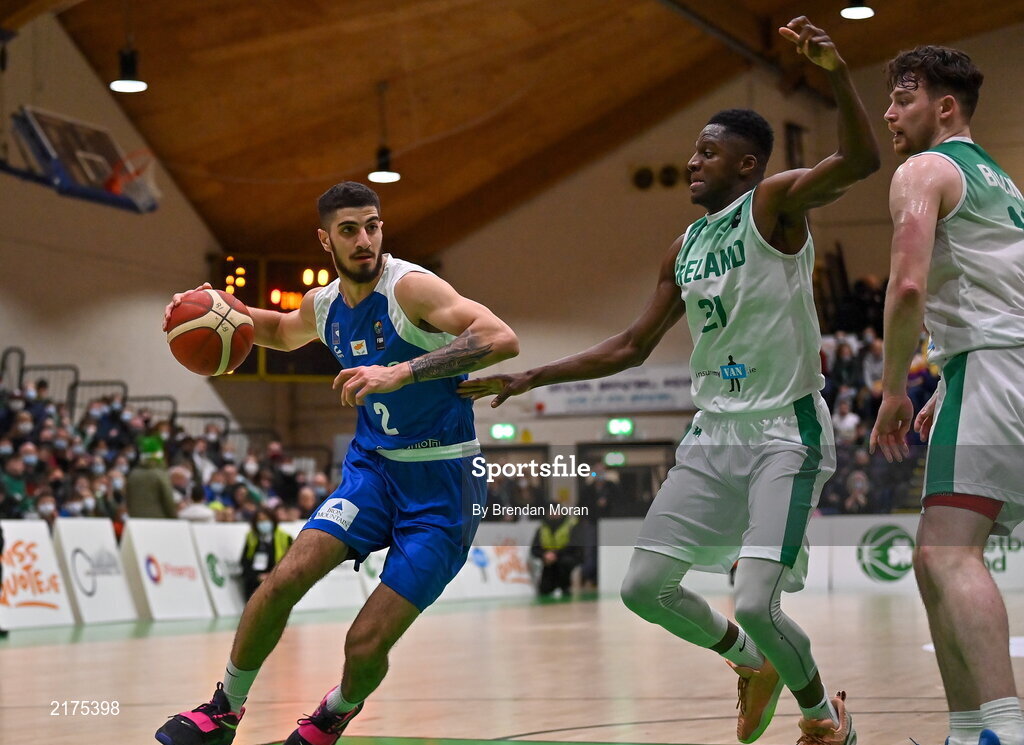27 February 2022; Zayd Muosa of Cyprus in action against Taiwo Badmus of Ireland during the FIBA EuroBasket 2025 Pre-Qualifiers First Round Group A match between Ireland and Cyprus at the National Basketball Arena in Tallaght, Dublin. Photo by Brendan Moran/Sportsfile