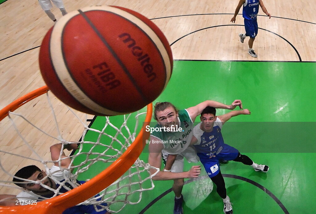 27 February 2022; James Gormley of Ireland and Filippos Vasileios Tigkas of Cyprus watch for a rebound during the FIBA EuroBasket 2025 Pre-Qualifiers First Round Group A match between Ireland and Cyprus at the National Basketball Arena in Tallaght, Dublin. Photo by Brendan Moran/Sportsfile