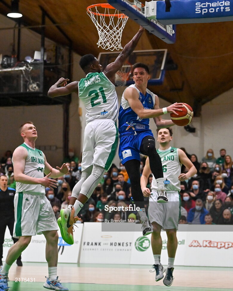 27 February 2022; Filippos Vasileios Tigkas of Cyprus in action against Taiwo Badmus of Ireland during the FIBA EuroBasket 2025 Pre-Qualifiers First Round Group A match between Ireland and Cyprus at the National Basketball Arena in Tallaght, Dublin. Photo by Brendan Moran/Sportsfile