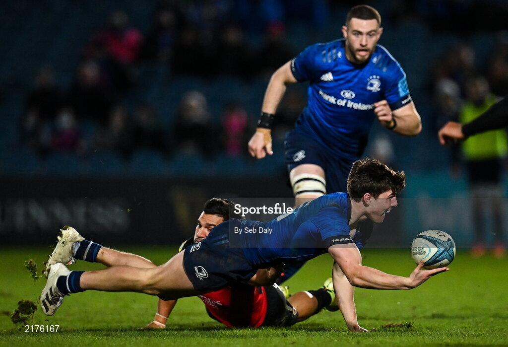 25 February 2022; Max O'Reilly of Leinster is tackled by Stean Pienaar of Emirates Lions during the United Rugby Championship match between Leinster and Emirates Lions at the RDS Arena in Dublin. Photo by Seb Daly/Sportsfile