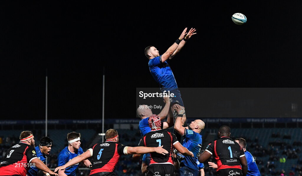 25 February 2022; Josh Murphy of Leinster takes possession in a lineout during the United Rugby Championship match between Leinster and Emirates Lions at the RDS Arena in Dublin. Photo by Seb Daly/Sportsfile