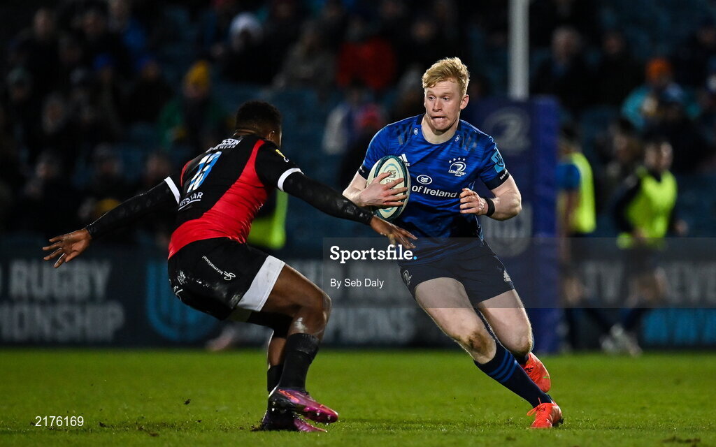 25 February 2022; Jamie Osborne of Leinster in action against Wandisile Simelane of Emirates Lions during the United Rugby Championship match between Leinster and Emirates Lions at the RDS Arena in Dublin. Photo by Seb Daly/Sportsfile