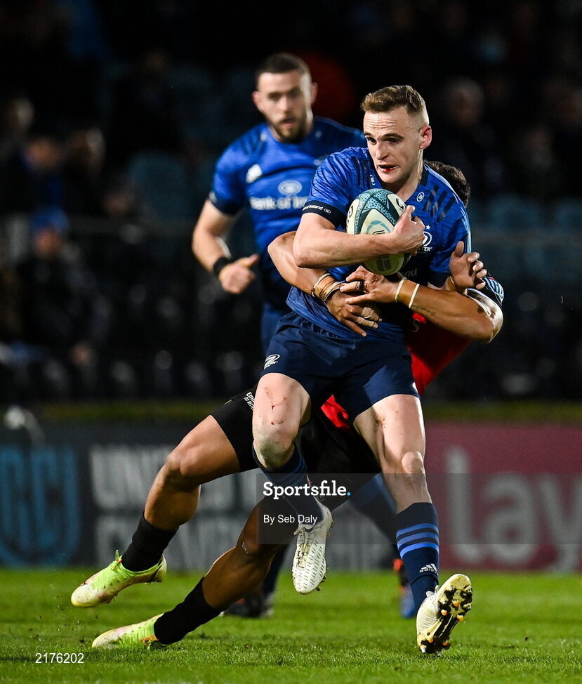 25 February 2022; Nick McCarthy of Leinster is tackled by Stean Pienaar of Emirates Lions during the United Rugby Championship match between Leinster and Emirates Lions at the RDS Arena in Dublin. Photo by Seb Daly/Sportsfile