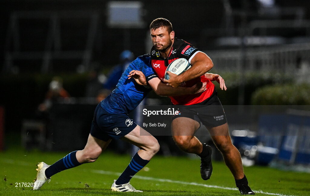 25 February 2022; Jac Visagie of Emirates Lions is tackled by Nick McCarthy of Leinster during the United Rugby Championship match between Leinster and Emirates Lions at the RDS Arena in Dublin. Photo by Seb Daly/Sportsfile