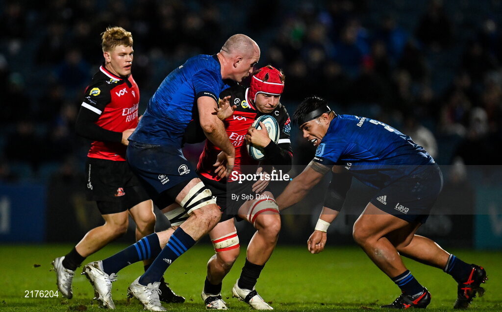 25 February 2022; Francke Horn of Emirates Lions is tackled by Devin Toner, left, and Michael Ala'alatoa of Leinster during the United Rugby Championship match between Leinster and Emirates Lions at the RDS Arena in Dublin. Photo by Seb Daly/Sportsfile
