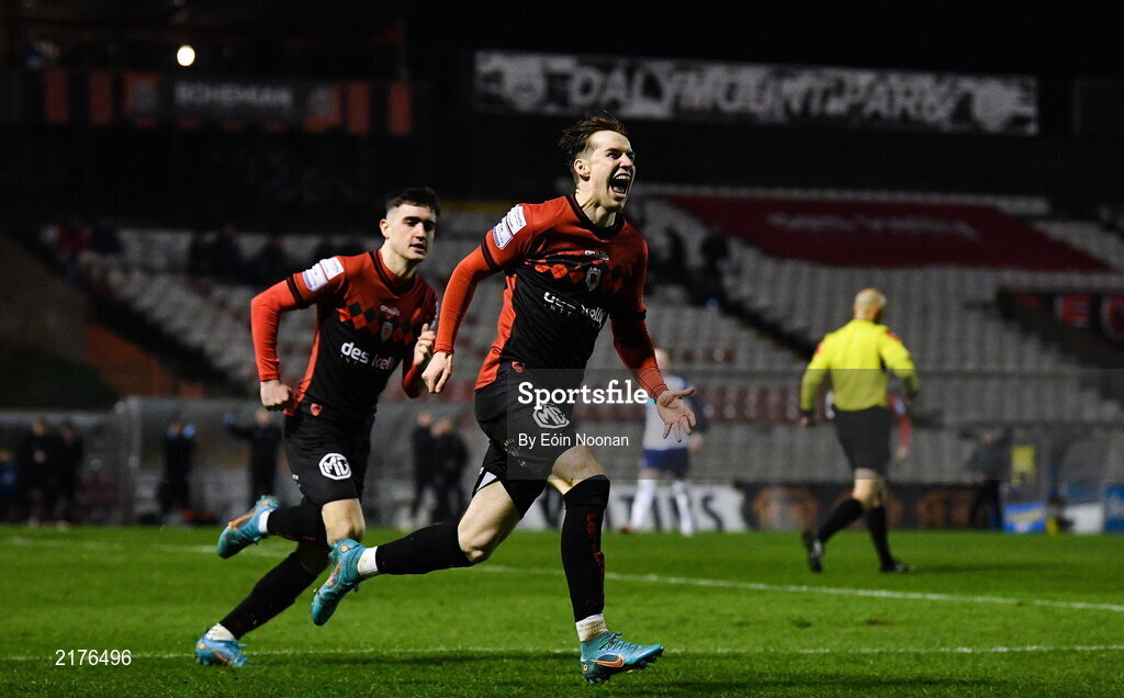 28 February 2022; Stephen Mallon of Bohemians celebrates after scoring his side's first goal during the SSE Airtricity League Premier Division match between Bohemians and St Patrick's Athletic at Dalymount Park in Dublin. Photo by Eóin Noonan/Sportsfile