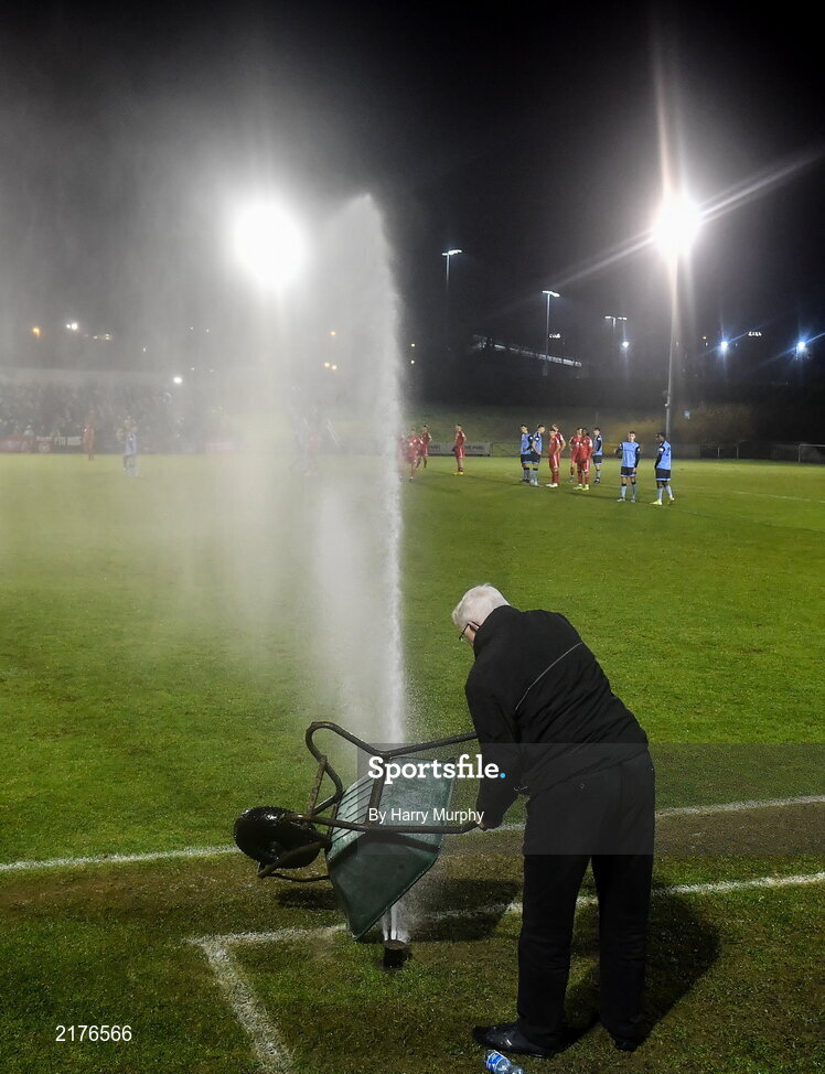 28 February 2022; Tony Sheridan of the UCD groundstaff attempts to stop a sprinkler with a wheelbarrow during the SSE Airtricity League Premier Division match between UCD and Shelbourne at UCD Bowl in Belfield, Dublin. Photo by Harry Murphy/Sportsfile