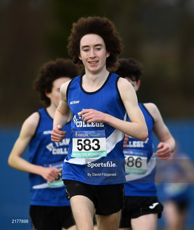 3 March 2022; Dylan Casey of St Flannans Ennis, crosses the line to win the senior boys 6000m during the Irish Life Health Munster Schools Cross Country Championships at Riverstick, Boulaling, Cork. Photo by David Fitzgerald/Sportsfile