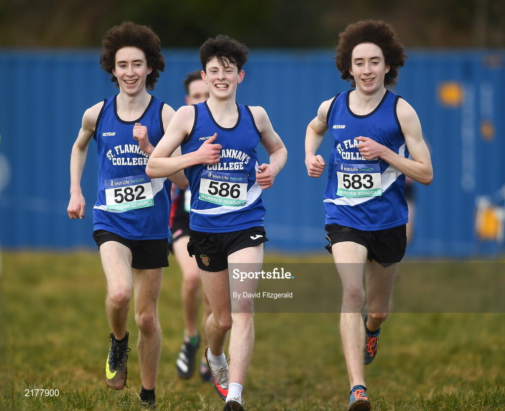3 March 2022; Team mates who finished first, second and third in the senior boys 6000m, from right, Dylan Casey, Niall Murphy and Dean Casey cross the finishing line during the Irish Life Health Munster Schools Cross Country Championships at Riverstick, Boulaling, Cork. Photo by David Fitzgerald/Sportsfile