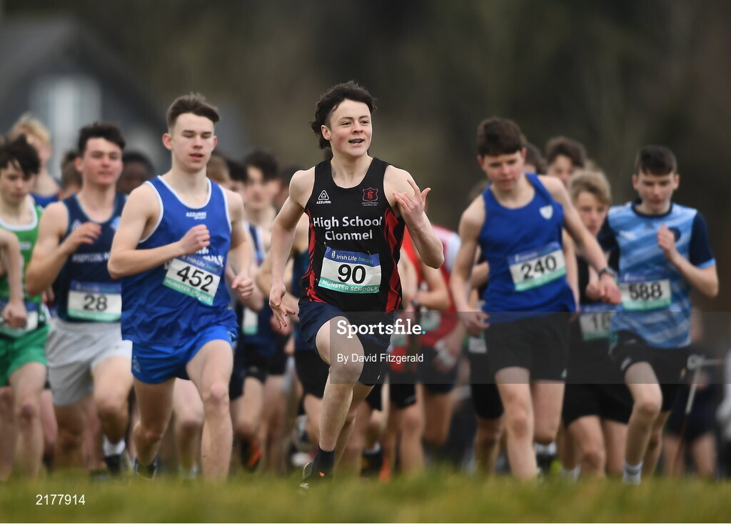3 March 2022; Conor O'Loughlin of CBS High School Clonmel, centre, competing in the intermediate boys 5000m during the Irish Life Health Munster Schools Cross Country Championships at Riverstick, Boulaling, Cork. Photo by David Fitzgerald/Sportsfile