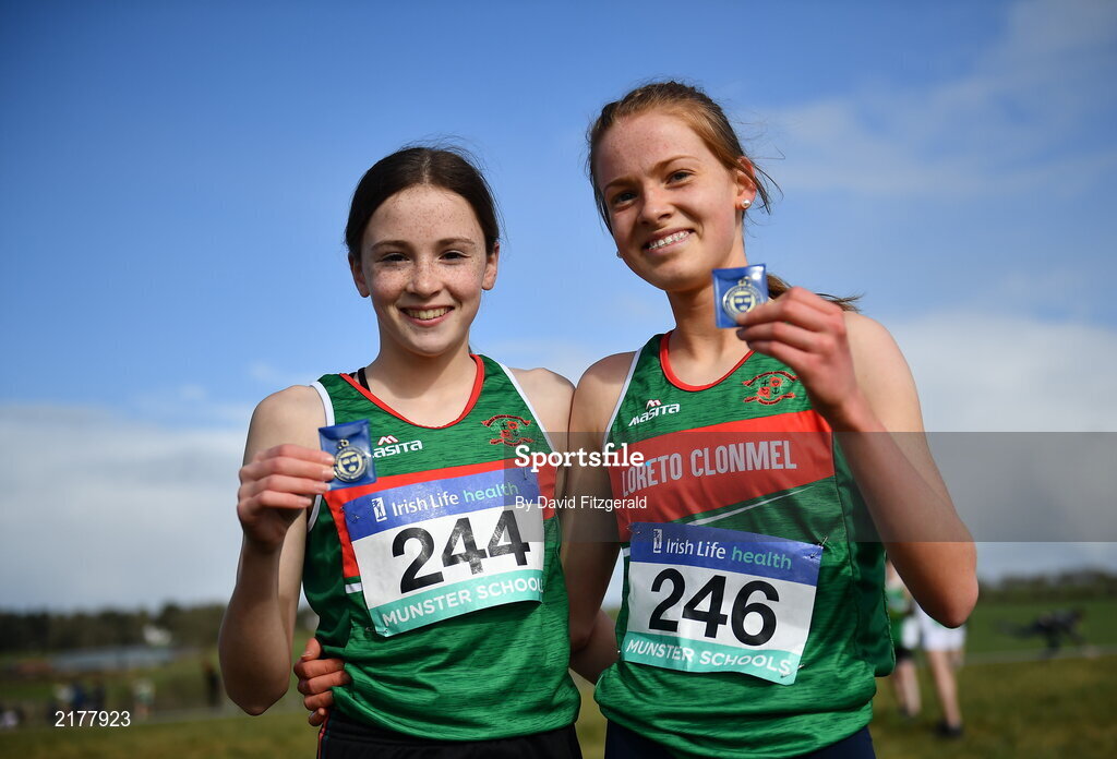 3 March 2022; Sisters Eavann Duffy, left, who won the junior girls 2500m and Muireann Duffy of Loreto Clonmel, who won the senior girls 3000m during the Irish Life Health Munster Schools Cross Country Championships at Riverstick, Boulaling, Cork. Photo by David Fitzgerald/Sportsfile