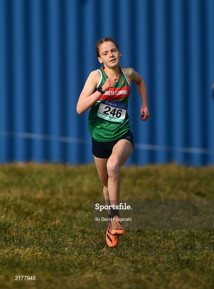 3 March 2022; Muireann Duffy of Loreto Clonmel on her way to winning the senior girls 3000m during the Irish Life Health Munster Schools Cross Country Championships at Riverstick, Boulaling, Cork. Photo by David Fitzgerald/Sportsfile