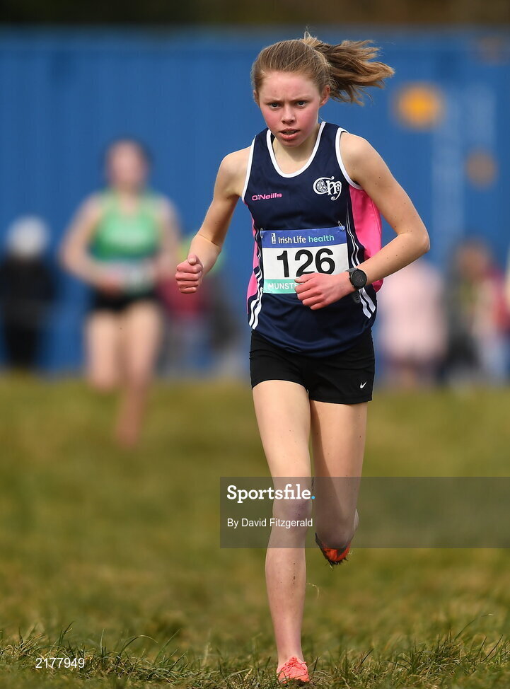 3 March 2022; Louise O'Mahony of Colaiste Muire Ennis on her way to winning the intermediate girls 3000m during the Irish Life Health Munster Schools Cross Country Championships at Riverstick, Boulaling, Cork. Photo by David Fitzgerald/Sportsfile