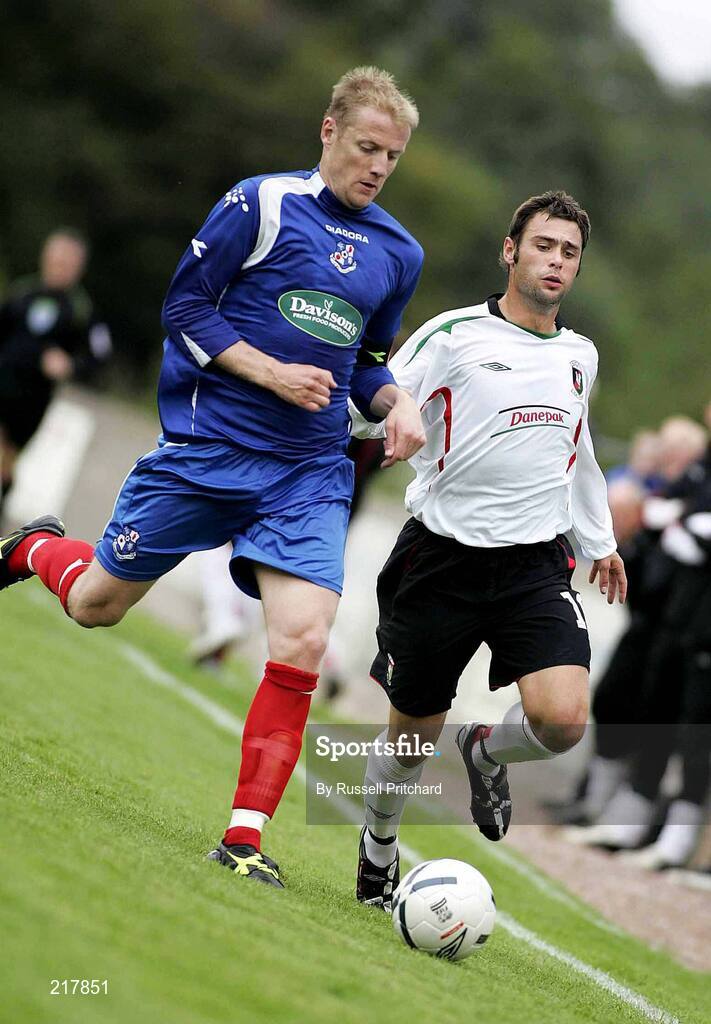 12 August 2006; Gary Hamilton, Glentoran, in action against Daragh Peden, Loughgall. CIS Insurance Cup, Loughgall v Glentoran, Lakeview Park, Loughgall, Co. Armagh. Picture credit: Russell Pritchard / SPORTSFILE