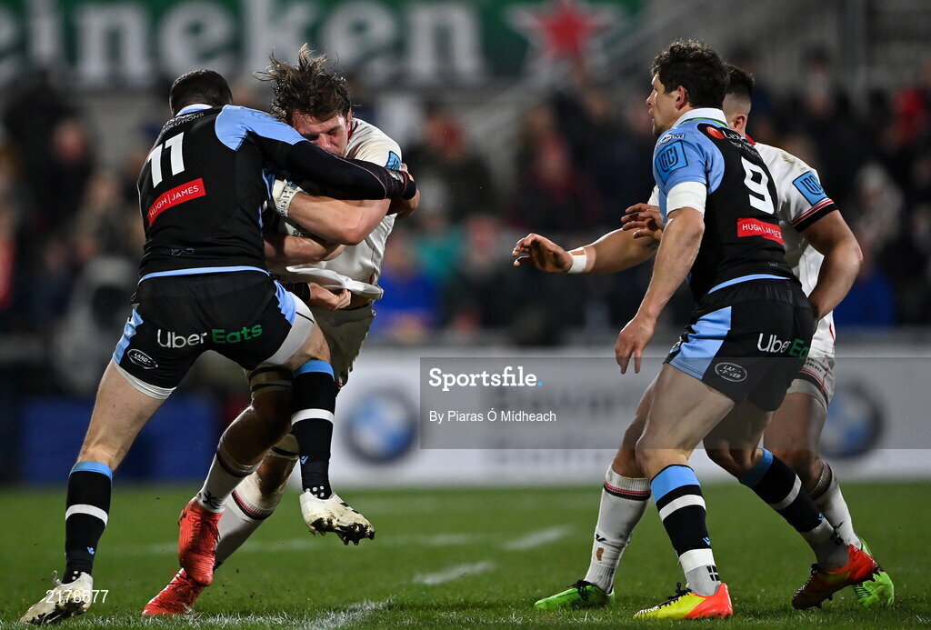 4 March 2022; Jordi Murphy of Ulster is tackled by Aled Summerhill of Cardiff during the United Rugby Championship match between Ulster and Cardiff at Kingspan Stadium in Belfast. Photo by Piaras Ó Mídheach/Sportsfile