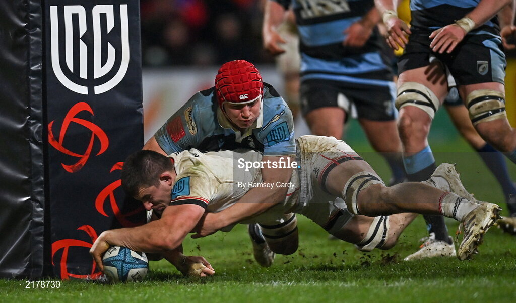 4 March 2022; Nick Timoney of Ulster dives over to score his side's fourth try during the United Rugby Championship match between Ulster and Cardiff at Kingspan Stadium in Belfast. Photo by Ramsey Cardy/Sportsfile
