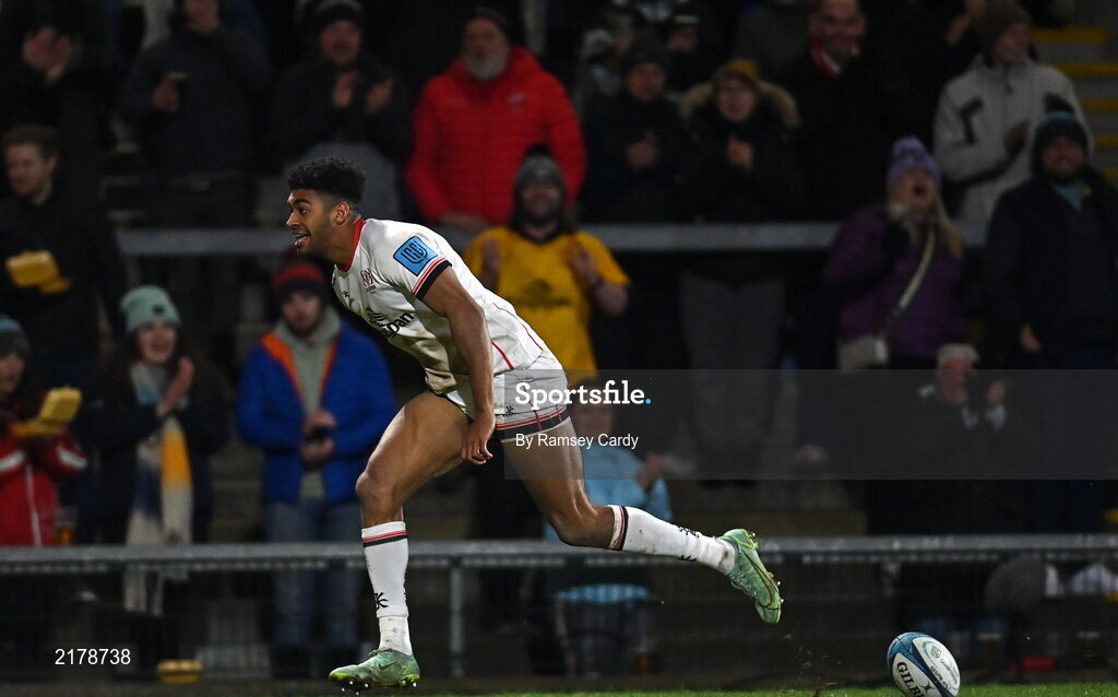 4 March 2022; Robert Baloucoune of Ulster after scoring his side's fifth try during the United Rugby Championship match between Ulster and Cardiff at Kingspan Stadium in Belfast. Photo by Ramsey Cardy/Sportsfile