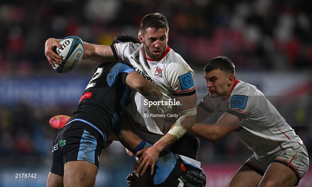 4 March 2022; Stuart McCloskey, supported by Ulster teammate Ben Moxham, is tackled by Willis Halaholo, left, and Rey Lee-Lo of Cardiff during the United Rugby Championship match between Ulster and Cardiff at Kingspan Stadium in Belfast. Photo by Ramsey Cardy/Sportsfile
