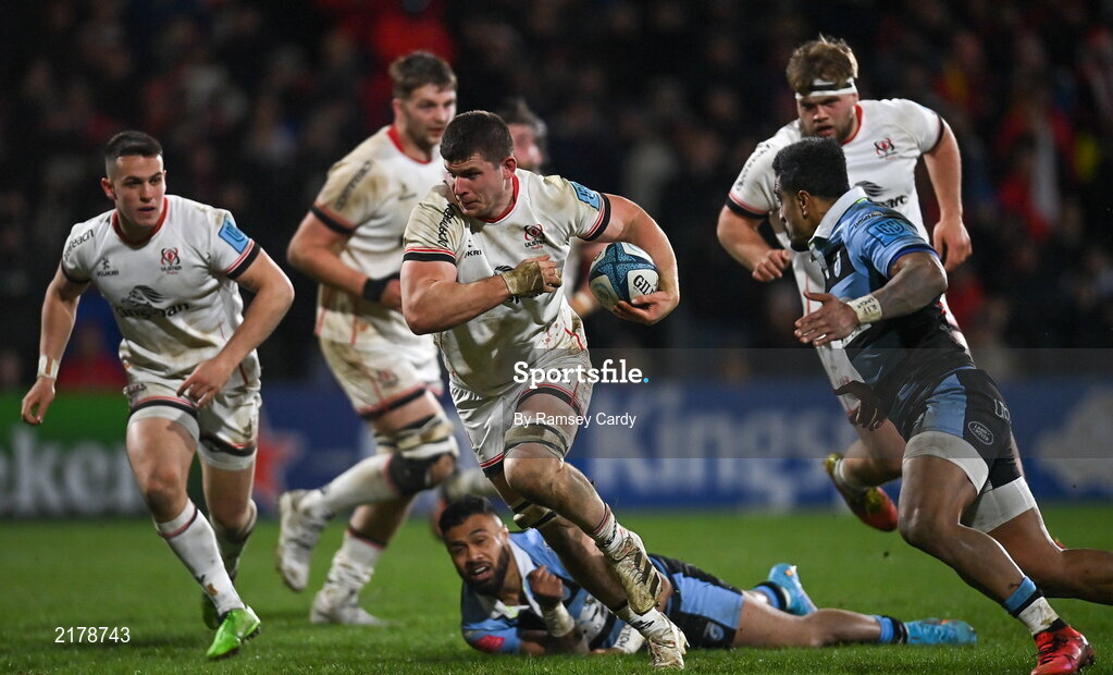 4 March 2022; Nick Timoney of Ulster on his way to scoring his side's fourth try during the United Rugby Championship match between Ulster and Cardiff at Kingspan Stadium in Belfast. Photo by Ramsey Cardy/Sportsfile