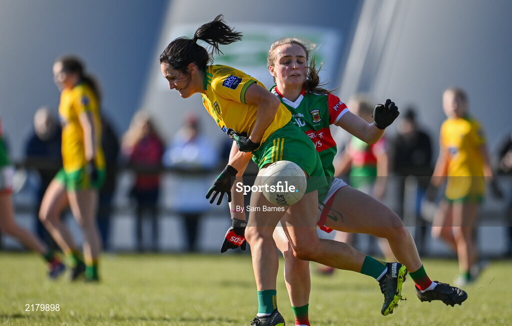 6 March 2022; Shelly Twohig of Donegal is tackled by Shauna Howley of Mayo during the Lidl Ladies Football National League Division Division 1A, Round 3 match between Mayo and Donegal at Connacht GAA Centre of Excellence in Bekan, Mayo. Photo by Sam Barnes/Sportsfile