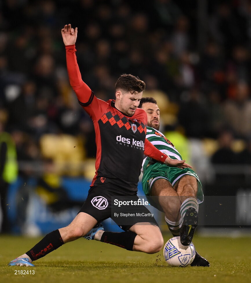 11 March 2022; Ryan Cassidy of Bohemians in action against Roberto Lopes of Shamrock Rovers during the SSE Airtricity League Premier Division match between Shamrock Rovers and Bohemians at Tallaght Stadium in Dublin. Photo by Stephen McCarthy/Sportsfile