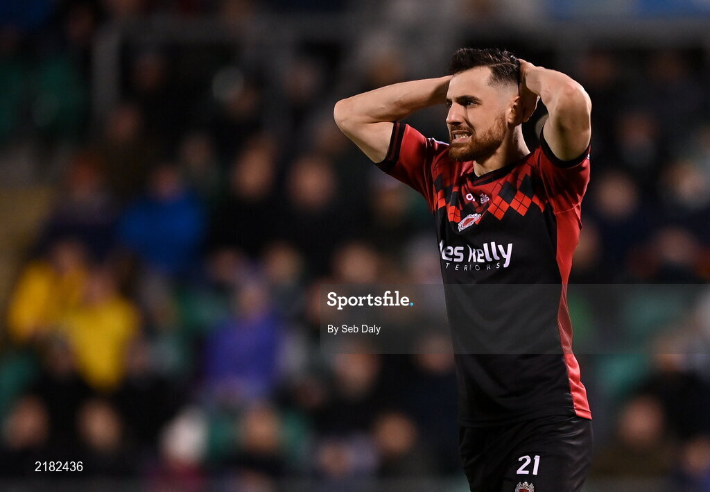 11 March 2022; Jordan Flores of Bohemians reacts after shooting wide during the SSE Airtricity League Premier Division match between Shamrock Rovers and Bohemians at Tallaght Stadium in Dublin. Photo by Seb Daly/Sportsfile