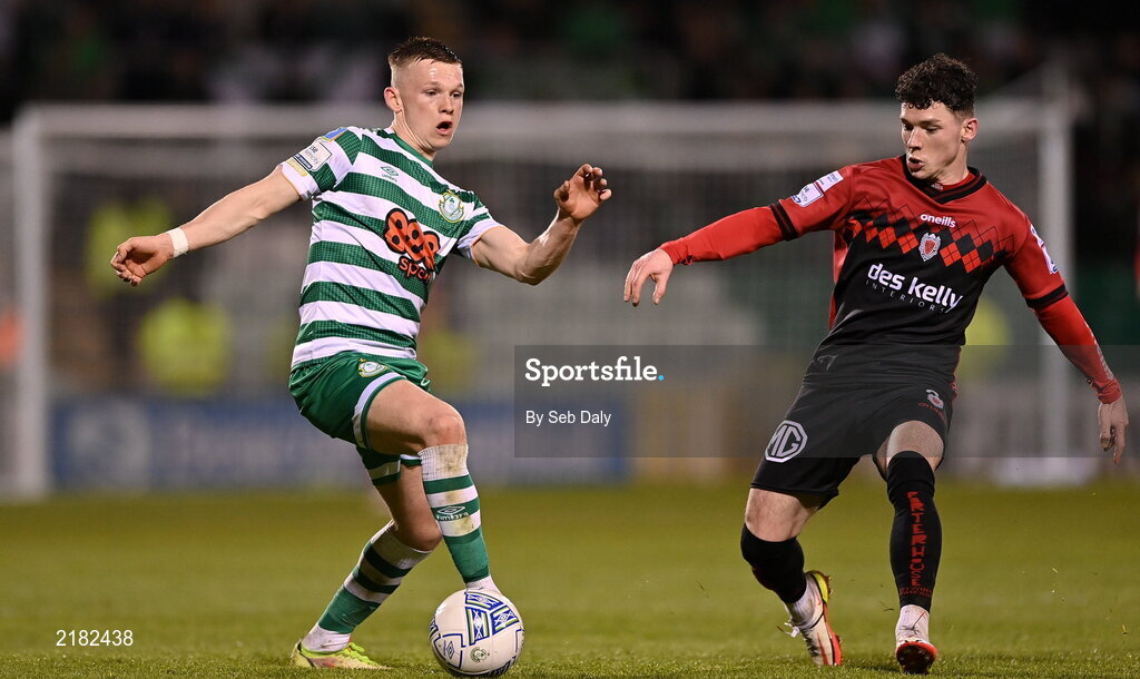 11 March 2022; Andy Lyons of Shamrock Rovers in action against Ali Coote of Bohemians during the SSE Airtricity League Premier Division match between Shamrock Rovers and Bohemians at Tallaght Stadium in Dublin. Photo by Seb Daly/Sportsfile