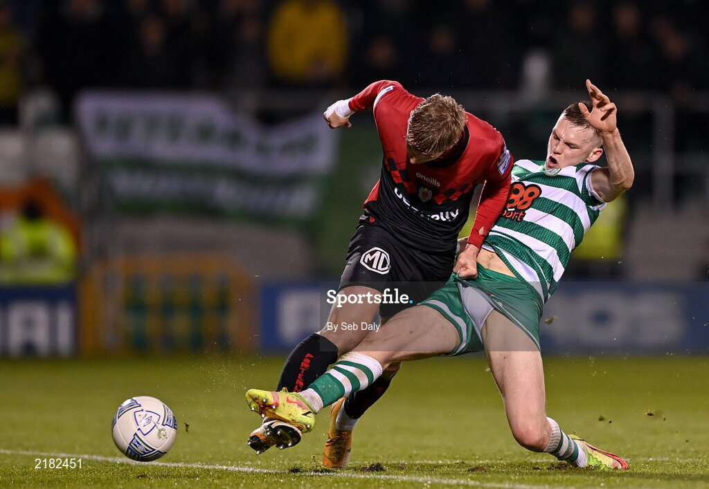 11 March 2022; Kris Twardek of Bohemians is tackled by Andy Lyons of Shamrock Rovers during the SSE Airtricity League Premier Division match between Shamrock Rovers and Bohemians at Tallaght Stadium in Dublin. Photo by Seb Daly/Sportsfile