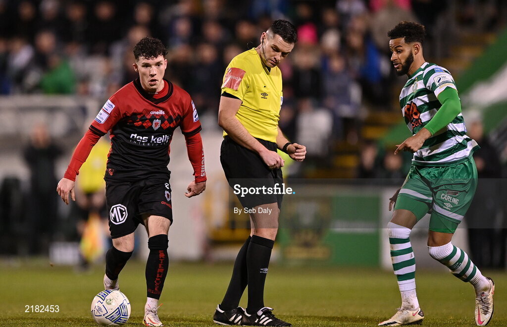 11 March 2022; Ali Coote of Bohemians in action against Barry Cotter of Shamrock Rovers, watched by referee Robert Hennessy, during the SSE Airtricity League Premier Division match between Shamrock Rovers and Bohemians at Tallaght Stadium in Dublin. Photo by Seb Daly/Sportsfile