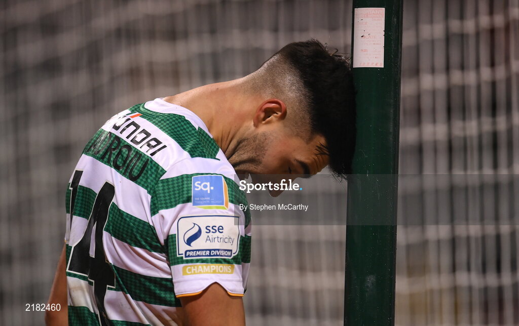 11 March 2022; Danny Mandroiu of Shamrock Rovers hits the goal stanchion in frustration during the SSE Airtricity League Premier Division match between Shamrock Rovers and Bohemians at Tallaght Stadium in Dublin. Photo by Stephen McCarthy/Sportsfile