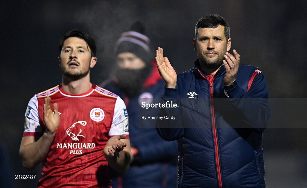 11 March 2022; St Patrick's Athletic manager Tim Clancy, right, and Ronan Coughlan of St Patrick's Athletic applaud supporters after their side's victory in the SSE Airtricity League Premier Division match between Finn Harps and St Patrick's Athletic at Finn Park in Ballybofey, Donegal. Photo by Ramsey Cardy/Sportsfile