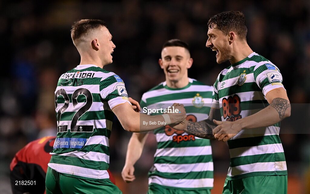 11 March 2022; Shamrock Rovers players Lee Grace, right, and Andy Lyons celebrate at the final whistle after their side's victory in the SSE Airtricity League Premier Division match between Shamrock Rovers and Bohemians at Tallaght Stadium in Dublin. Photo by Seb Daly/Sportsfile